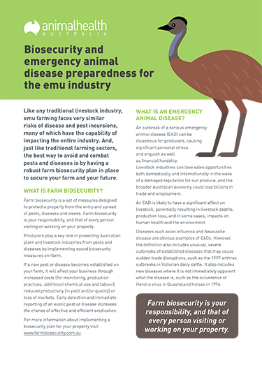 Animal Health Australia has teamed up with Charles Sturt University to develop biosecurity resources and emergency animal disease preparedness information for new and emerging livestock industries including emu, turkey, dairy sheep, buffalo, deer and harvesting industries including rangeland goats and kangaroos.